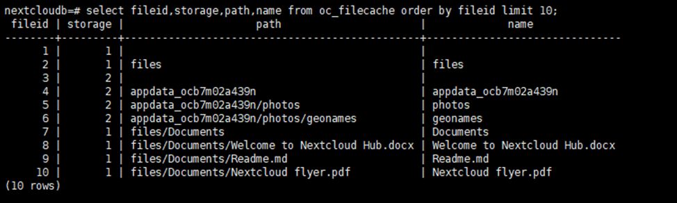 psql -qt -d {{ dbname }} -U $dbUser  -c "select concat('urn:oid:', fileid, ' ', substring(id from 8), path) from oc_filecache join oc_storages on storage = numeric_id where id like 'local::%' order by id;" > metadata.txt